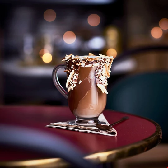 Ringla lite Nutella i botten på ett glas. Bred lite Nutella på kanten av glaset, doppa eller pressa i nöthack på kanten. Slå på kaffe och toppa med skummad kokosdryck.