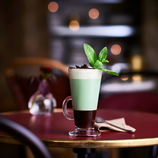 Häll chokladsåsen i botten på en kopp eller glas. Lägg sedan 2–3 skivor After eight i botten. Slå på 1 dl kaffe, rör om så det blandas och toppa/skikta den varma mjölken/ärtdrycken, färgad med lite grön husshållsfärg. Toppa med en klick grädde, hyvla över chokladflis och garnera med ett myntablad. Servera direkt.