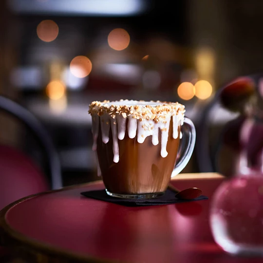 Ringla lite Nutella i botten på ett glas. Bred lite Nutella på kanten av glaset, doppa eller pressa i nöthack på kanten. Slå på kaffe och toppa med skummad kokosdryck.