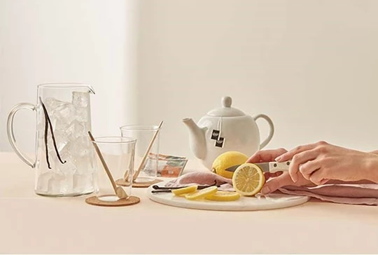 Skiva en fjärdedels citron och blanda dem tillsammans med isbitar i en kanna som rymmer 5 dl varmt vatten. Isbitarna ska fylla nästan hela kannan.